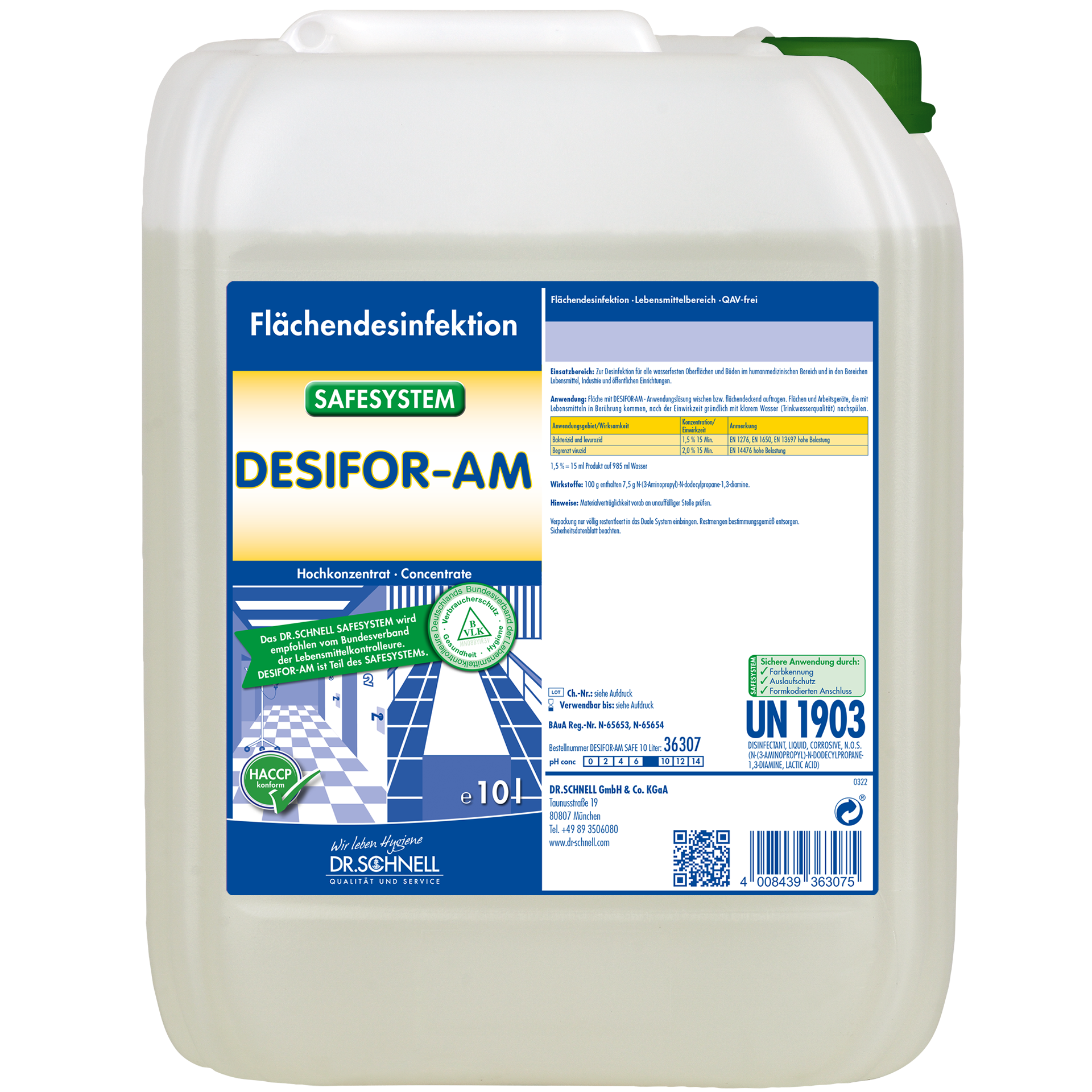 Fläche mit DESIFOR-AM - Anwendungslösung wischen. Flächen und Arbeitsgeräte, die mit Lebensmitteln in Berührung kommen, nach Ablauf der Einwirkzeit mit Wasser von Trinkwasserqualität abspülen. Anwendungsbeispiel für 1 Liter einer 1,5%igen Lösung: 985 ml Wasser vorlegen und 15 ml Produkt zugeben.