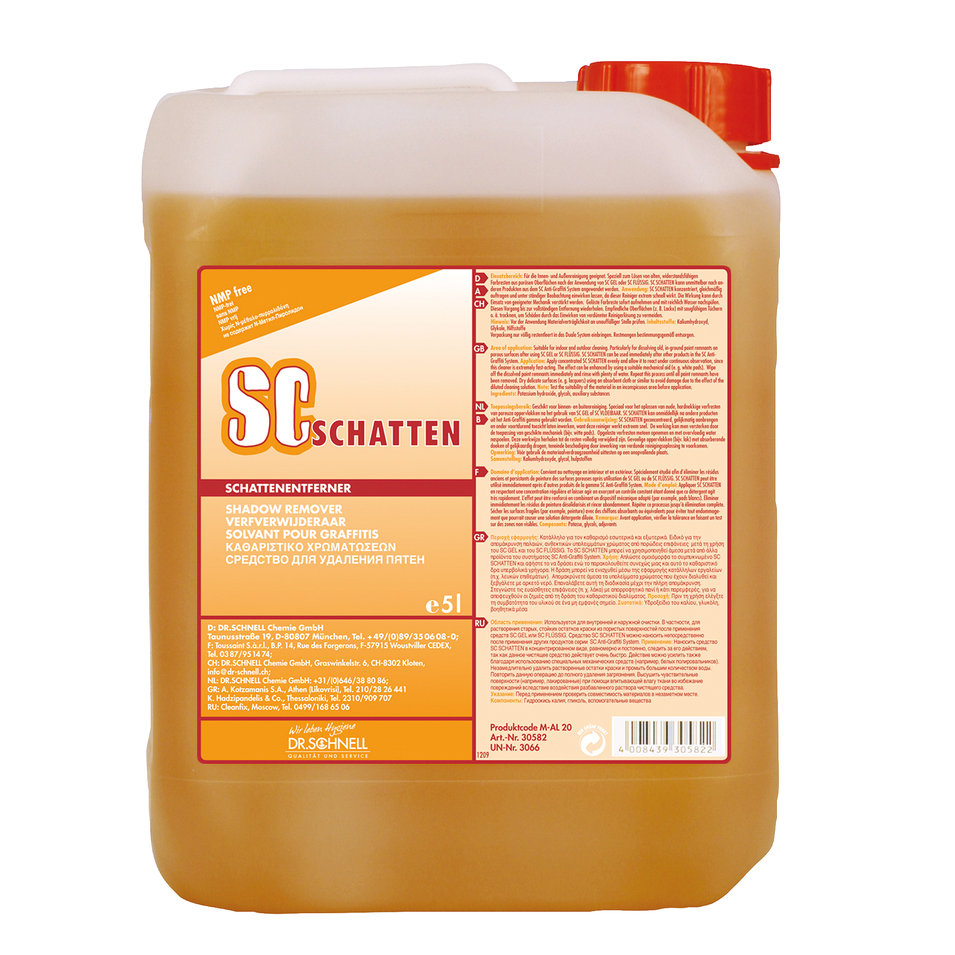 SC SCHATTEN unverdünnt und gleichmäßig auftragen. Löseprozess überwachen. Nach Einsetzen des Löseprozesses Graffiti ggf. mit geeigneter Mechanik bearbeiten. Gelöste Farbe sofort gründlich entfernen. Als letzten Schritt gereinigte Fläche mit reichlich Wasser nachspülen. Empfindliche Oberflächen wie z.B. Lacke nach der Reinigung mit saugfähigen Tüchern o. Ä. trocknen, um Schäden durch nachträgliches Einwirken des Reinigers zu vermeiden. Arbeitsschritte wenn nötig wiederholen, bis das gewünschte Ergebnis erreicht ist.