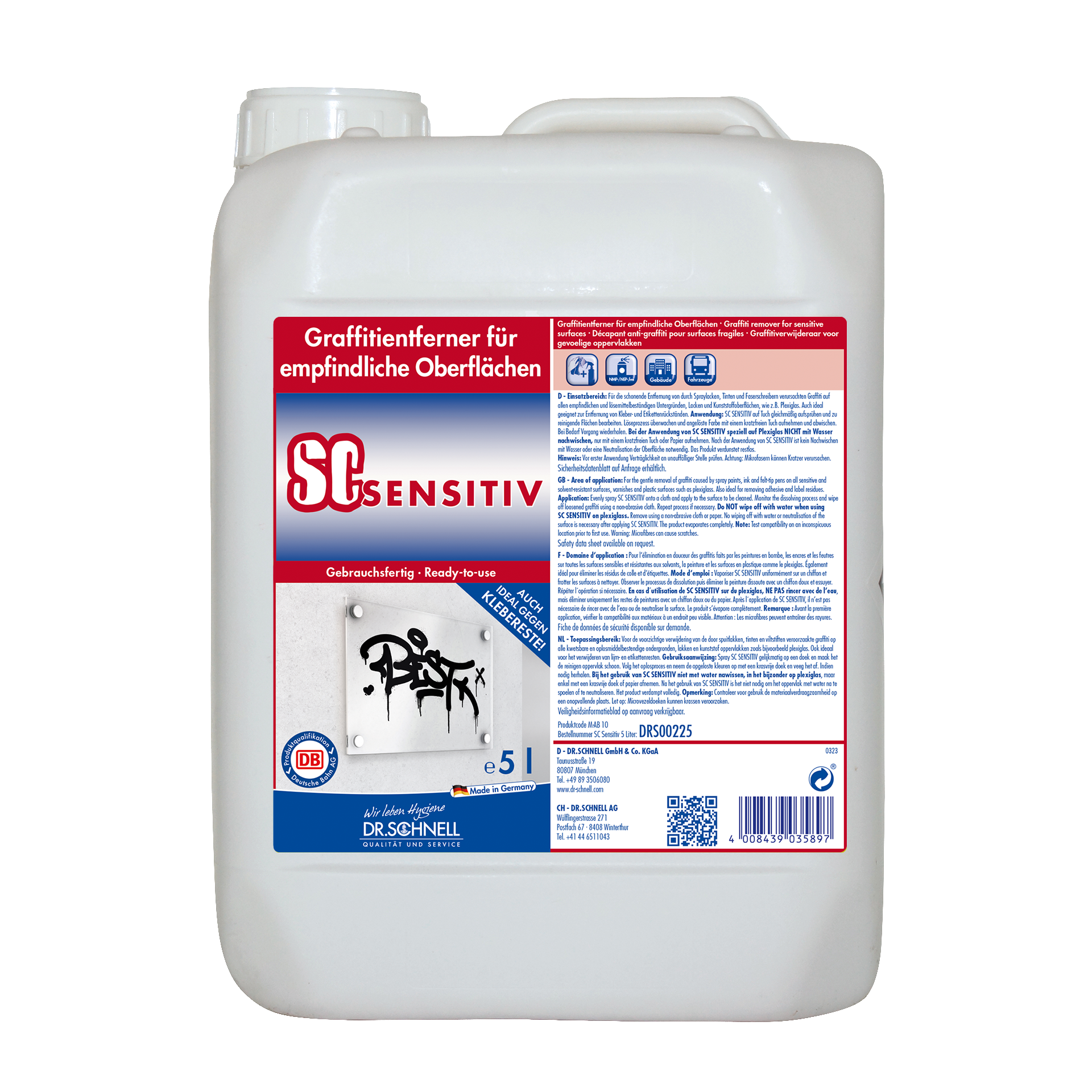 Für die schonende Entfernung von durch Spraylacken, Tinten und Faserschreibern verursachten Graffiti auf allen empfindlichen und lösemittelbeständigen Untergründen, Lacken und Kunststoffoberflächen, wie z.B. Plexiglas.