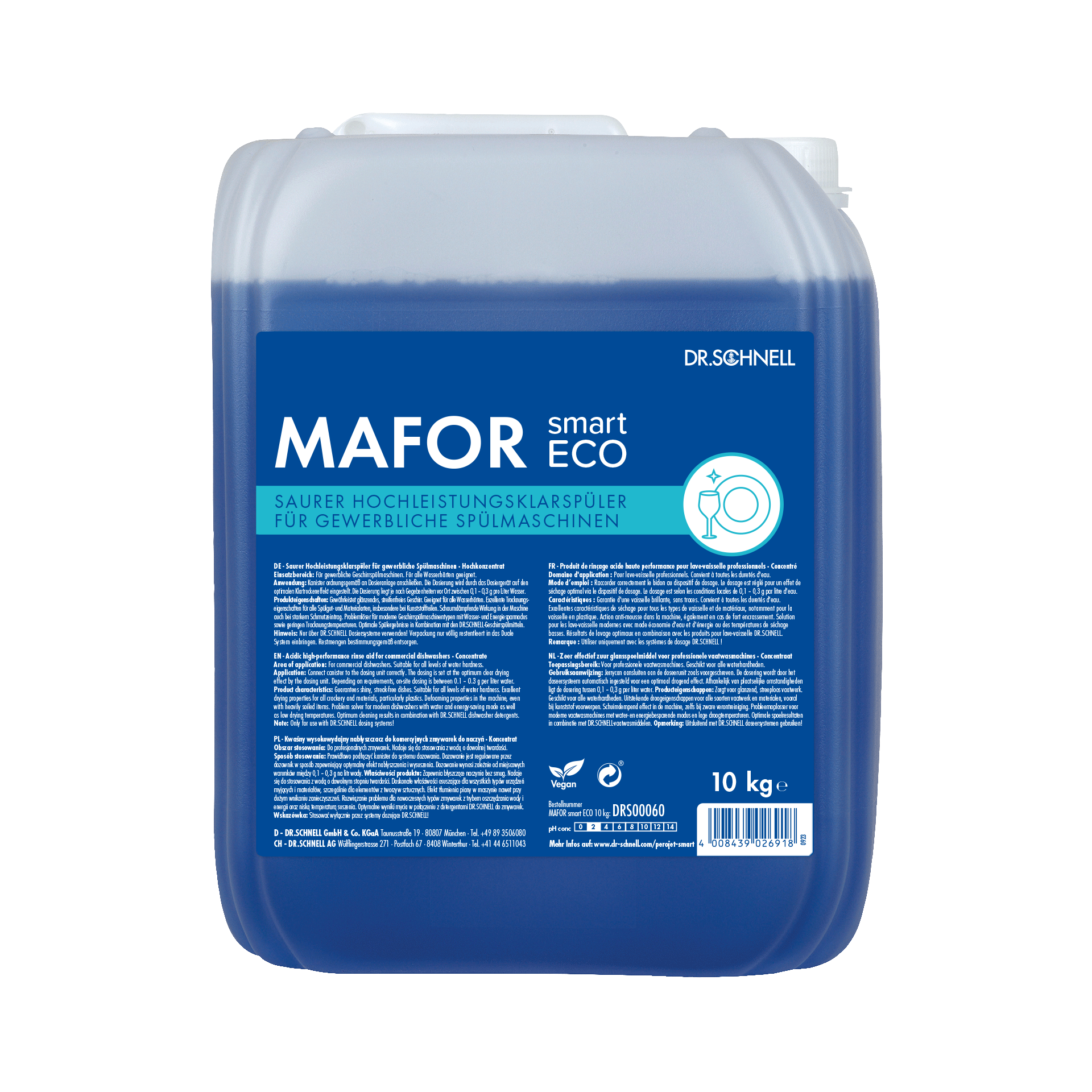 Saurer Hochleistungsklarspüler für gewerbliche Geschirrspülmaschinen (Hauben-/Kastentransport- und Bandgeschirrspülmaschinen). Tenside der neuesten Generation ermöglichen optimale Trocknungsergebnisse auf allen Materialien inkl. Kunststoffe und Glas. Optimale Spülergebnisse bei allen Wasserhärten. Nur über ein Dosiergerät verwenden, bei dem die Dosiermenge entsprechend eingestellt werden kann. Zur exakten Dosierung empfehlen wir die Zugabe zur Spülflotte über das DR.SCHNELL Dosiergerät PEROJET smart TEC.