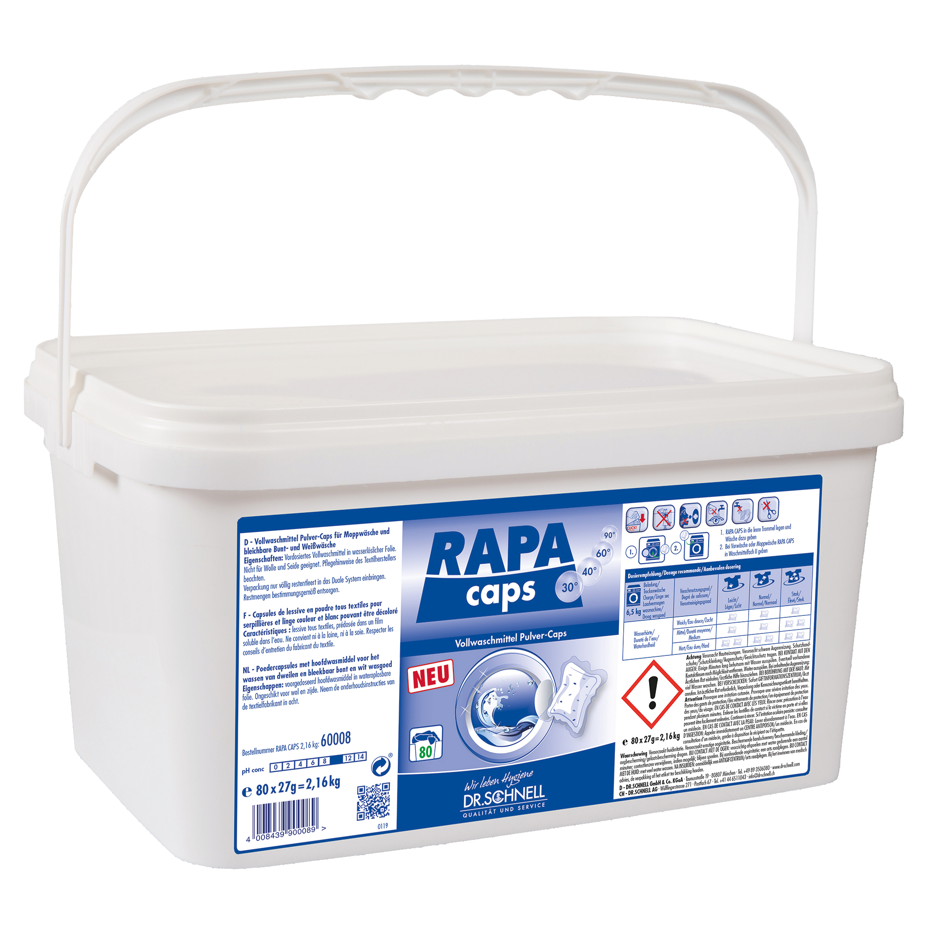 Zur manuellen Dosierung. RAPA CAPS in die leere Trommel legen und Wäsche dazu geben. Dosierung je nach Wasserhärte und Verschmutzungsgrad 1 bis 2 Caps.
